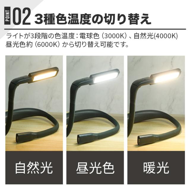 【3種色温度の切り替え&無段階調光】このライトは、3段階の色温度(電球色:3000K、自然光:4000K、昼光色:約6000K)を選択可能で、無段階調光機能により、お好みの輝度や色温度に調整できます。これにより、夜勤の仕事、勉強、読書を自分に合った明るさで行うことができます。