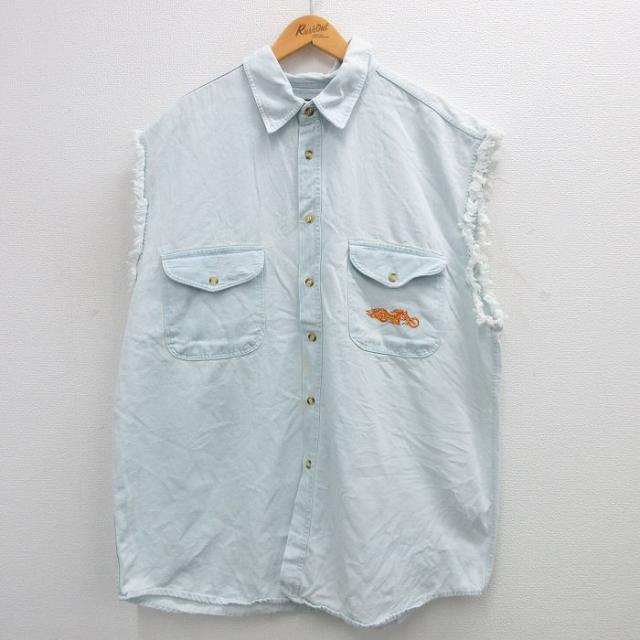 【商品名】 XL★古着 ノースリーブ シャツ メンズ 00年代 00s ワシ 大きいサイズ ロング丈 コットン 薄紺 デニム