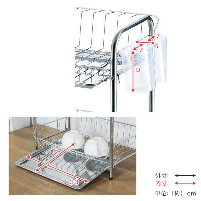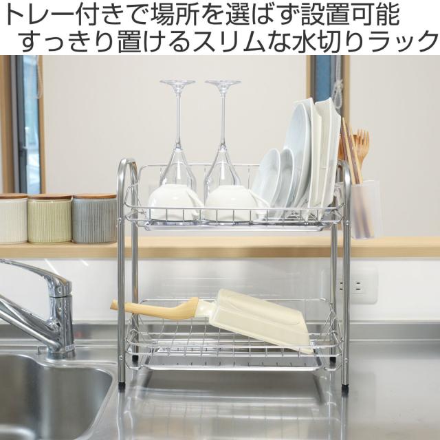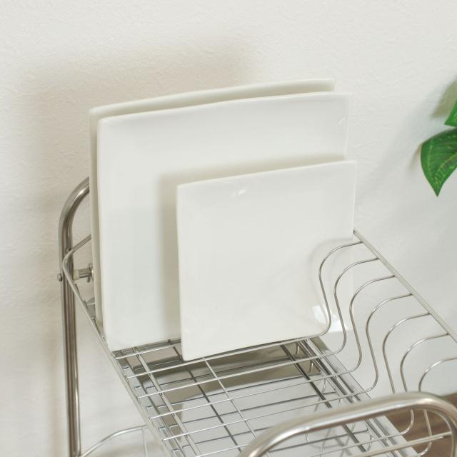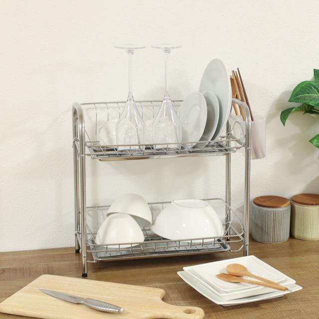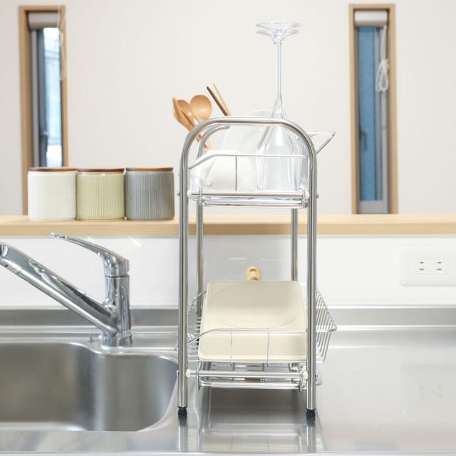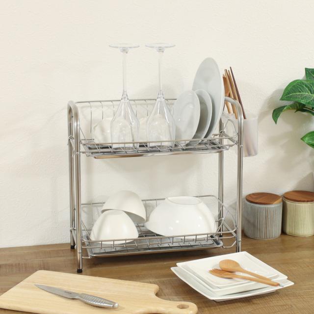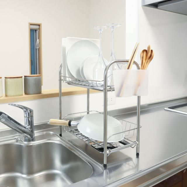 ステンレス製の2段式水切りラックです。奥行22cmのスリム設計なので、シンク横やコンパクトなキッチンにもおすすめです。