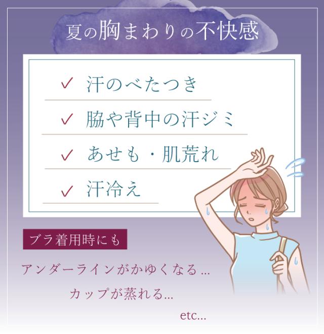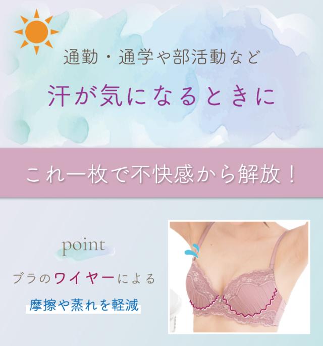 汗を吸収して不快感を軽減するブラ下インナー。ブラをつける前に着用するだけで、汗のべたつきや汗ジミ、蒸れをおさえて快適キープ。ブラ着用時のワイヤー部分のかゆみや蒸れも軽減。肌にもやさしいコットン×シルクだから汗を吸収して涼しく快適に過ごせます。丸編みでシームレス&タグなしだから刺激もなくストレスフリー。通勤通学や部活動など、汗をたくさんかく季節におすすめです。
