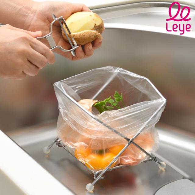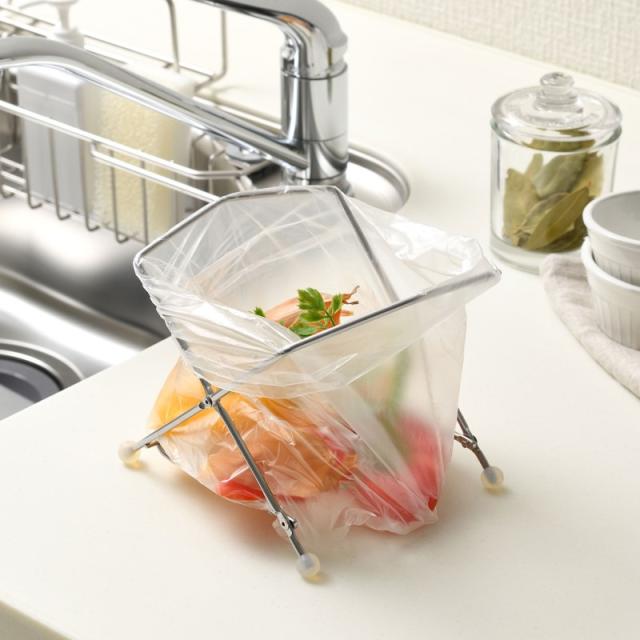 調理する時にサッと広げてポリ袋をセット。その場で生ゴミを捨て、後は袋をしばってゴミ箱にポイッ!