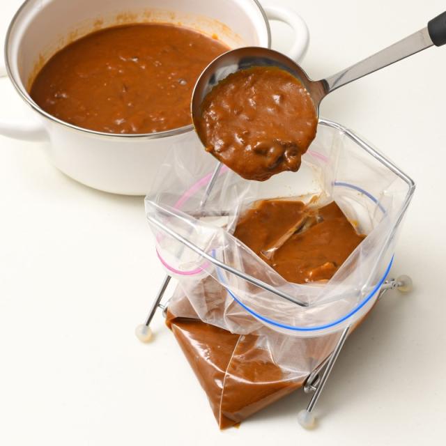 保存袋の口を大きく開いてしっかりと保持できます。余った食材の移し替えがスムーズ。