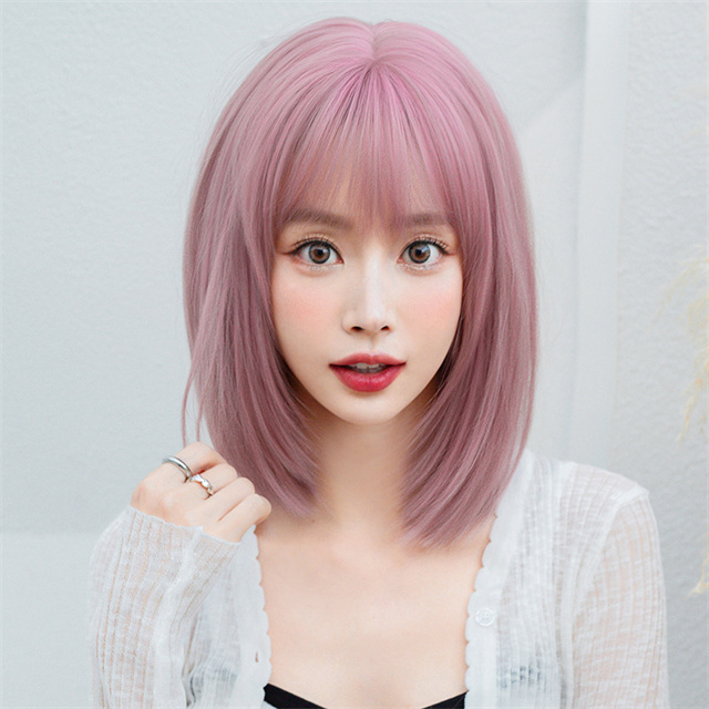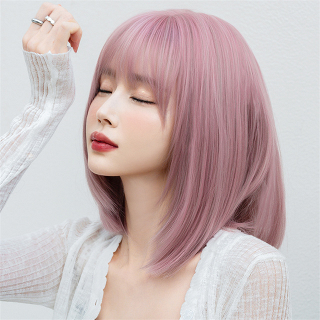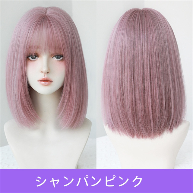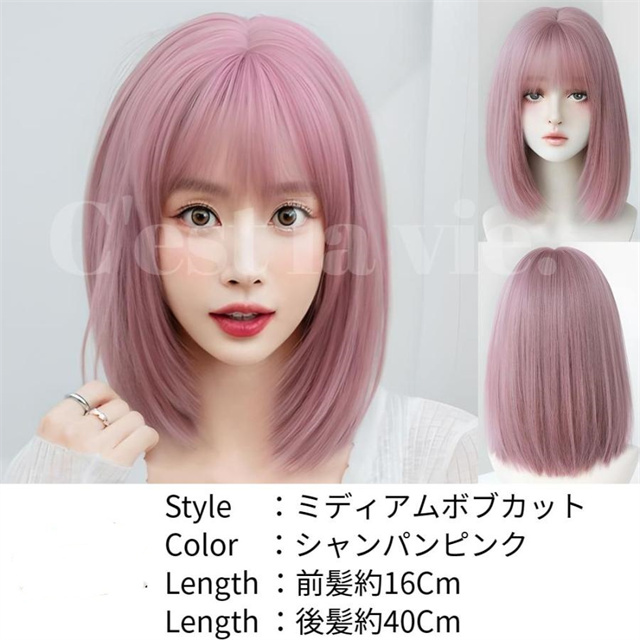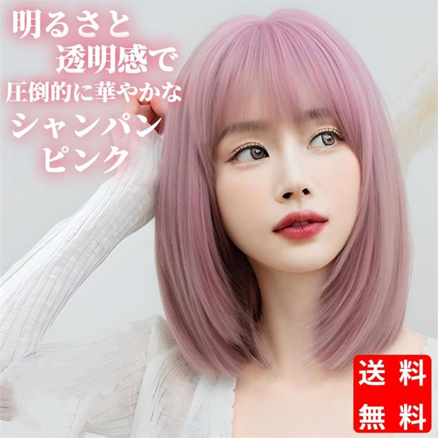ウィッグ ミディアム ボブ シャンパン ピンク フルウィッグ ネット付き 前髪あり 自然 バレない 普段使い おしゃれ 小顔効果 送料無料