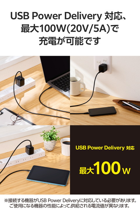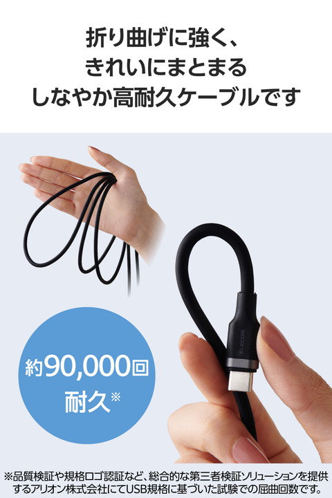 スマートフォンもパソコンも、これ1本で高速充電!USB2.0、USB Power Delivery(最大100W)対応のUSB Type-C(TM) - USB Type-Cケーブルです。なめらかな手触りで、やわらかく扱いやすいシリコン素材を採用しています。![]() ■スマートフォンもパソコンも、これ1本で高速充電!やわらかく扱いやすいUSB Type-C(TM) - USB Type-Cケーブルです。 ■USB Type-Cポート搭載のAC充電器・モバイルバッテリー・パソコンと、USB Type-Cポート搭載のスマートフォン・タブレットなどを接続し、充電やデータ転送ができます。 ■シリコン素材を採用した、なめらかな手触りのケーブルです。やわらかく絡みにくいのが特長で、狭い場所への配線や、持ち運びにも便利です。 ■約90,000回の屈曲に耐えられる優れた耐久性を実現したケーブルです。 ■※品質検証や規格ロゴ認証など、総合的な第三者検証ソリューションを提供するアリオン株式会社にてUSB規格に基づいた試験での屈曲回数 ■コネクター部分には高級感のあるアルミ装飾を施しています。 ■USB2.0に対応しています。 ■最大480Mbpsの高速データ転送が可能です。 ※理論値 ■USB Power Deliveryに対応し、最大100Wで充電が可能です。スマートフォンやタブレット、パソコンなどに使用できます。 ■※接続する機器がUSB Power Deliveryに対応している必要があります。 ■※ご使用になる機器の性能によって、供給される電流値が異なります。 ■USB Type-Cコネクターは、裏、表に関係なくポートに挿し込めます。 ■サビなどに強く信号劣化を抑える金メッキピンを採用しています。 ■難燃性の素材を使用し、安全性を高めています。 ■外部ノイズの干渉から信号を保護する2重シールドケーブルを採用しています。 ■※USB Type-C and USB-C are trademarks of USB Implementers Forum ■EUの「RoHS指令(電気・電子機器に対する特定有害物質の使用制限)」に準拠(10物質)した、環境にやさしい製品です。 ■自社環境認定基準を1つ以上満たし、『THINK ECOLOGY』マークを表示した製品です。 ■環境保全に取り組み、製品の包装容器におけるプラスチック重量を、社内基準製品より20%以上削減した製品です。 ■環境保全に取り組み、製品の包装容器が紙・ダンボール・ポリ袋のみで構成されている製品です。 ![]() ■コネクター形状:USB Type-C(TM)プラグ - USB Type-Cプラグ ■対応機種:USB Type-Cポート搭載のAC充電器・モバイルバッテリー・パソコンおよび、USB Type-Cポート搭載のスマートフォン・タブレットなど ■規格:Hi-Speed USB(USB2.0) ■対応転送速度:最大480Mbps ※理論値 ■USB Power Delivery対応:○ ■対応電圧/電流:最大20V/5A(100W) ■DisplayPort Alternate Mode対応:× ■プラグメッキ仕様:金メッキピン ■シールド方法:2重シールド ■ツイストペアケーブル(通信線):○ ■ケーブル長:約2m ※コネクター含まず ■ケーブル太さ:約4.3mm ■カラー:ブラック ■パッケージ形態:袋+ステッカー ■保証期間:1年間 ■環境配慮事項:EU RoHS指令準拠、THINK ECOLOGYマーク |