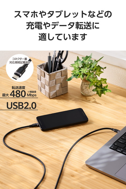 スマートフォンもパソコンも、これ1本で高速充電!USB2.0、USB Power Delivery(最大100W)対応のUSB Type-C(TM) - USB Type-Cケーブルです。なめらかな手触りで、やわらかく扱いやすいシリコン素材を採用しています。