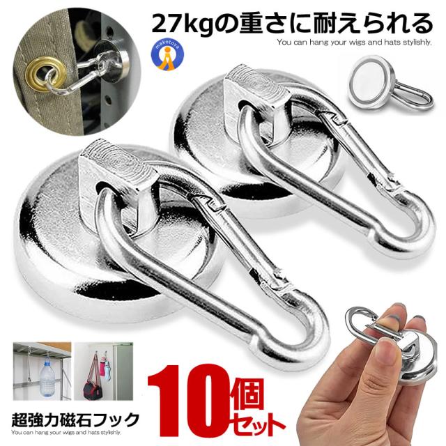 10個セット マグネットフック カラビナ カラビナ付磁石 マグネット フック取外可能 超強力 耐腐食 再利用可能 跡がつかない 垂直耐荷重27kg 2-MAGKKAR s-mh0826-16a