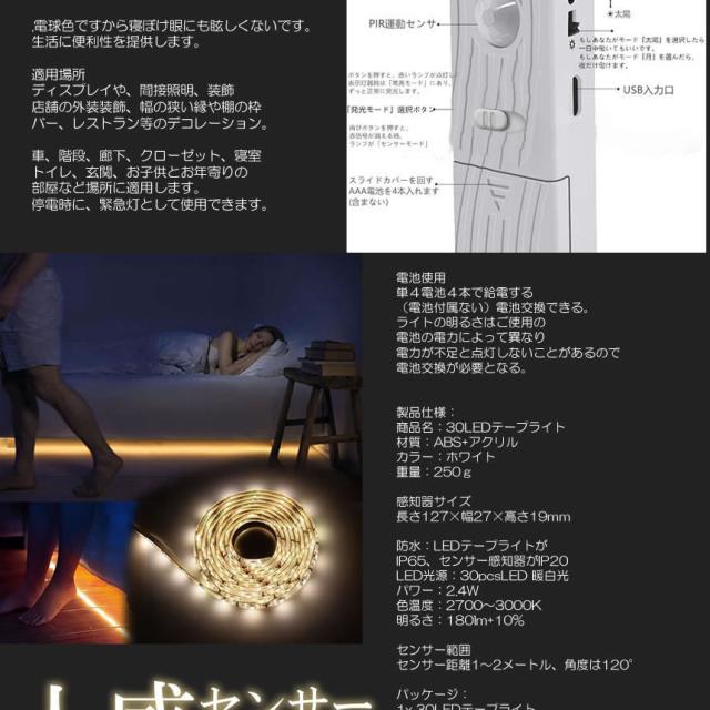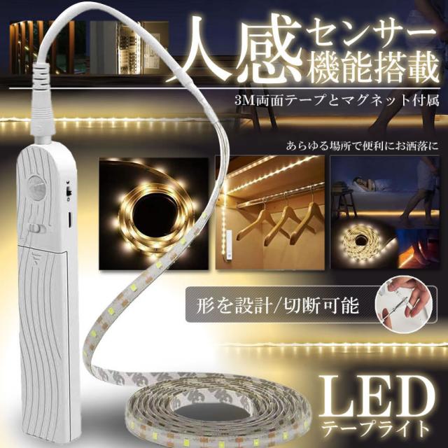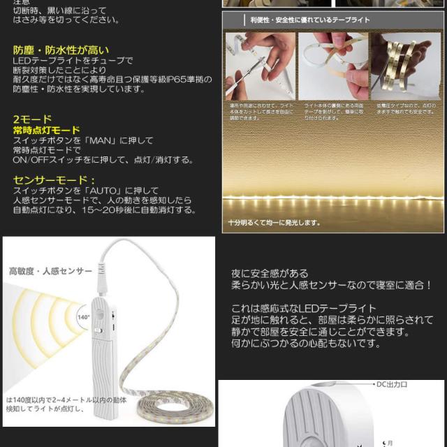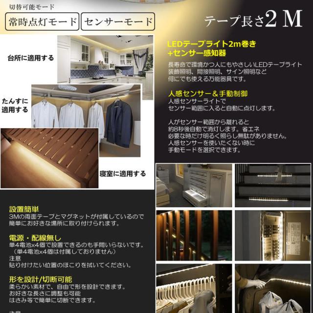2個セット LEDテープ 2m 人感センサー搭載 電池式 照明 電球色 2モード 常時点灯 センサー 階段 防水可能 自動点灯 省エネ 両面テープ 棚下 間接照明 ZITERAN s-mh0924-10a