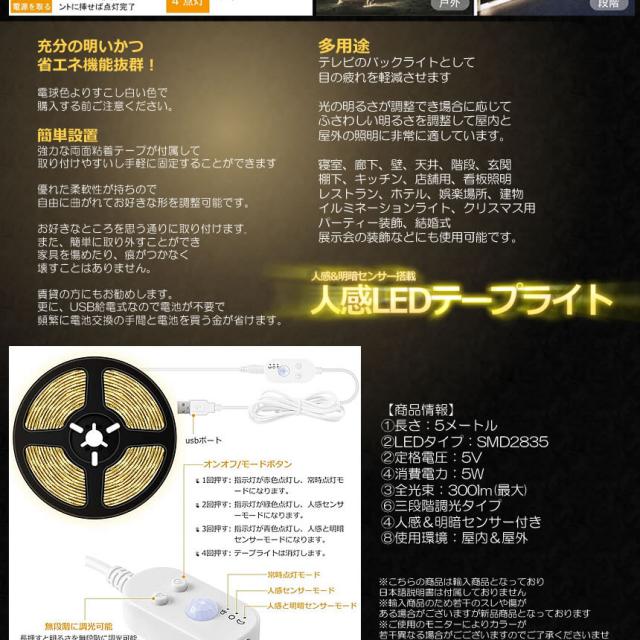 2個セット 無段階調光 人感センサー搭載 LEDテープライト 5m ライト 照明 明暗 自動点灯 センサー 調光 明るさ調整 切断 両面テープ USB給電式 MUZISET s-mh1128-16a