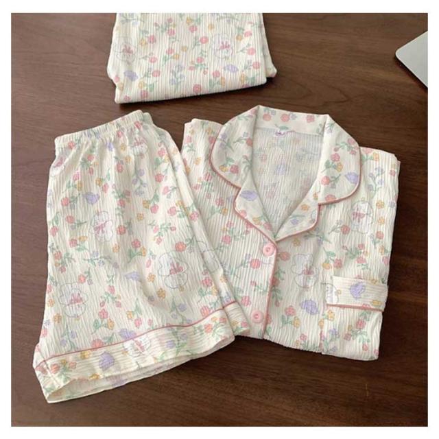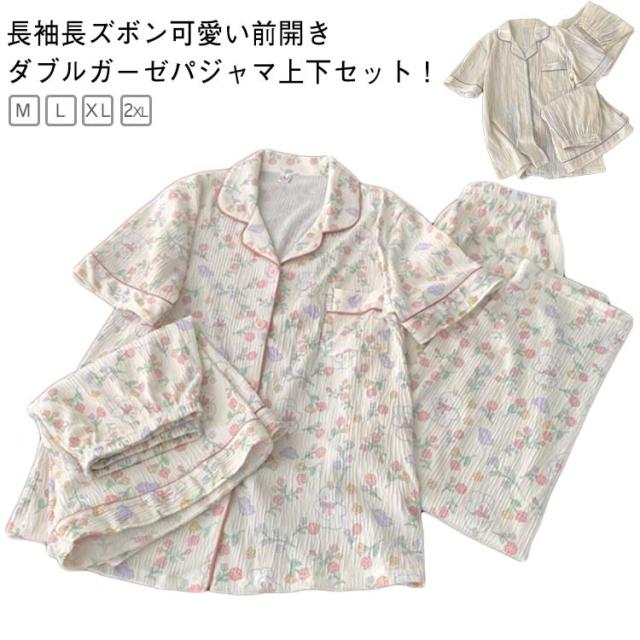 | 綿 長袖長ズボン可愛い前開きダブルガーゼパジャマ上下セット! | |