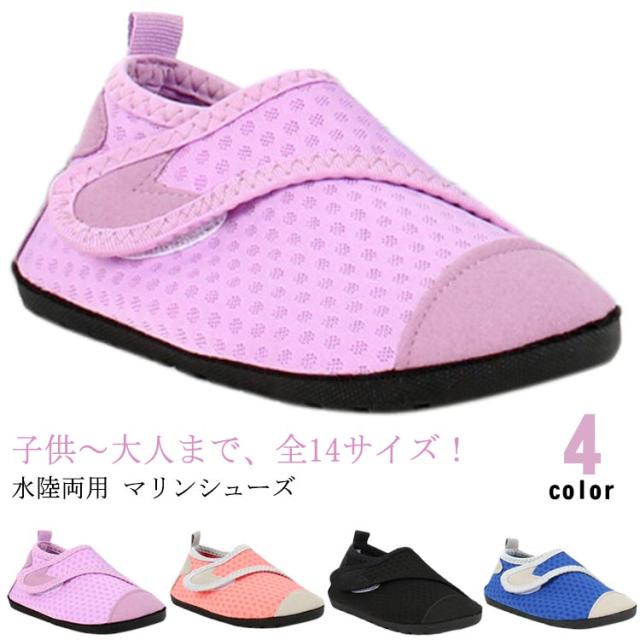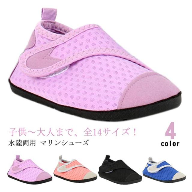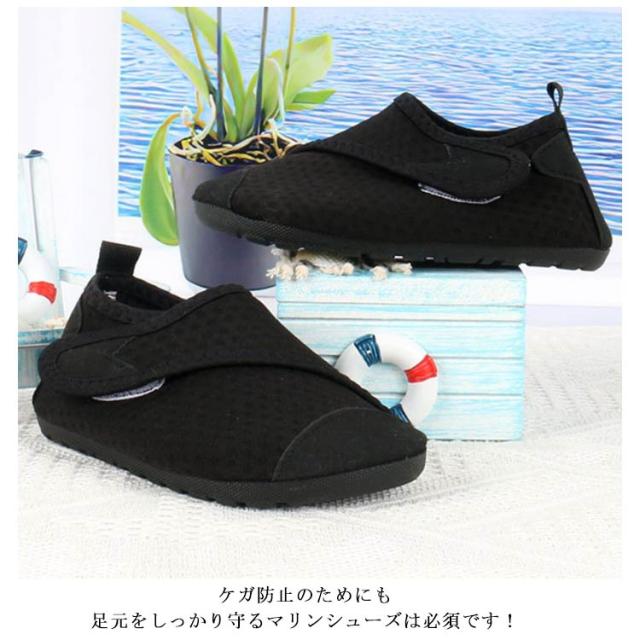 | 子供〜大人まで、全14サイズ!海や川遊び、プールや水遊びなど夏のレジャーに欠かせない配色マリンシューズ! 履き口がマジックテープになっていてガバっと開くから履かせやすい。 浜辺やビーチサイドは砂や砂利、ガラスやプラスチック片などが落ちている可能性もあり、裸足のままでは危険もいっぱい! ケガ防止のためにも足元をしっかり守るマリンシューズは必須です! | |
