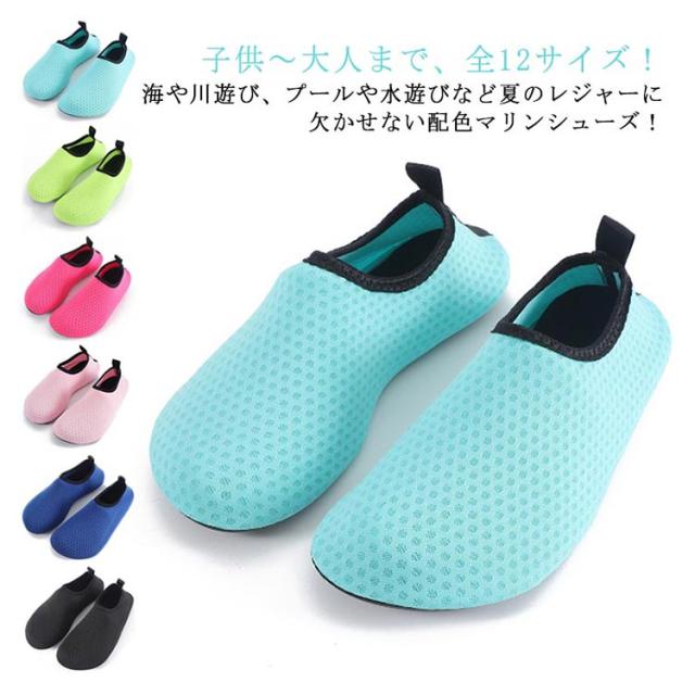 | 子供〜大人まで、全12サイズ!海や川遊び、プールや水遊びなど夏のレジャーに欠かせない配色マリンシューズ! 浜辺やビーチサイドは砂や砂利、ガラスやプラスチック片などが落ちている可能性もあり、裸足のままでは危険もいっぱい! ケガ防止のためにも足元をしっかり守るマリンシューズは必須です! | |