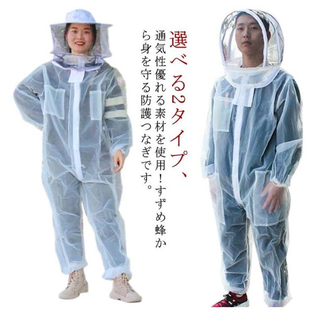 | 選べる2タイプ、通気性優れる素材を使用!すずめ蜂から身を守る防護つなぎです。 春夏に最適な全体メッシュデザイン! 軽量で機能性に優れ、着脱が容易なつなぎ服。 | |