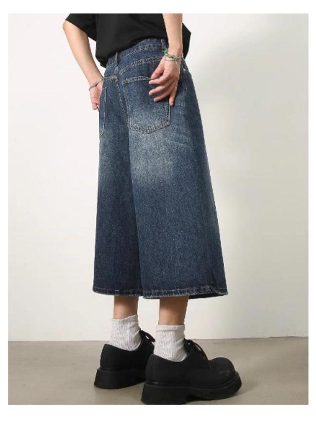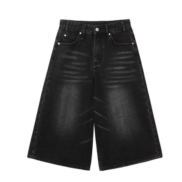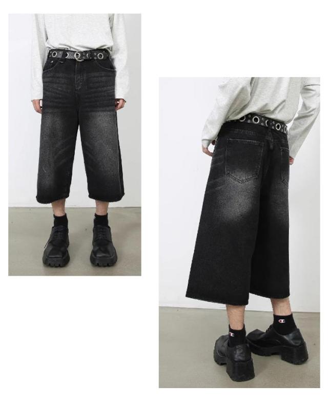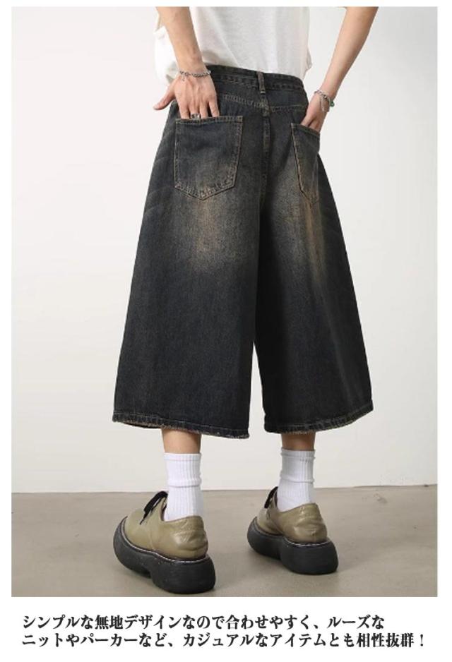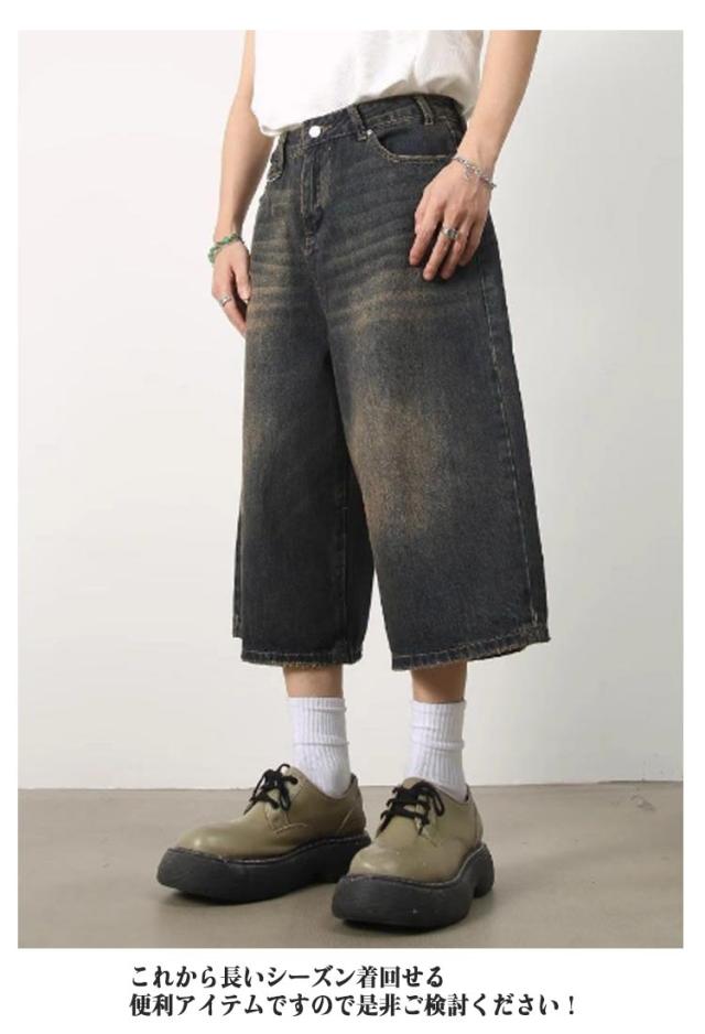 デニムパンツ 7分丈 ショートパンツ ハーフパンツ メンズ ジーンズ ジーパン ワイドパンツ ヴィンテージ風 膝下 ひざ下 クロップドパンツ ストリート系 ヒップホップ 個性派 衣装 おしゃれ