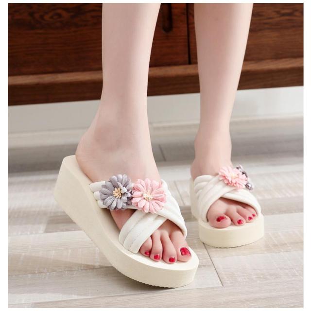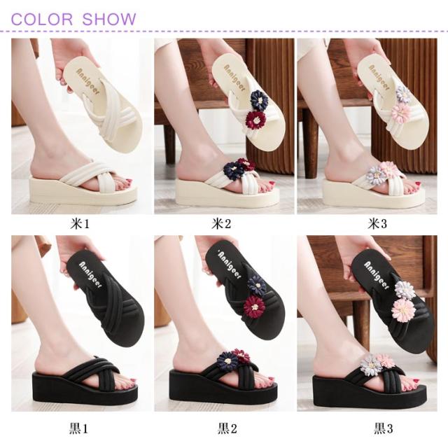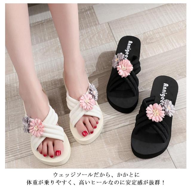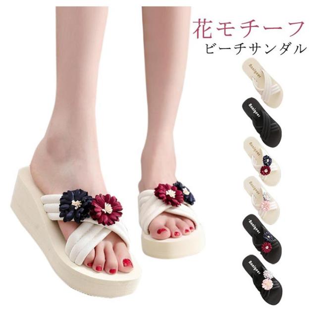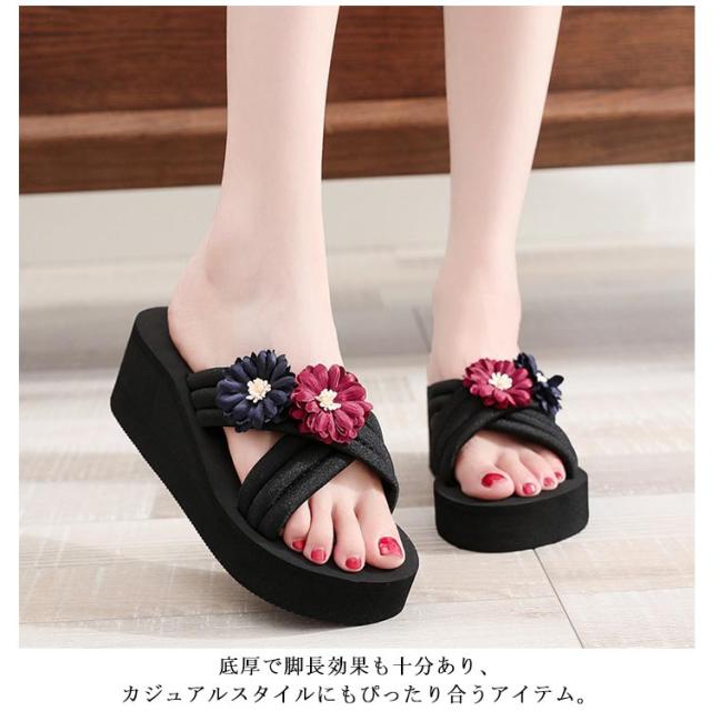 レディース 美脚サンダル ビーチサンダル クロスベルト ミュール ミュールサンダル ウェッジソール 花モチーフ ローヒール 花モチーフ 靴 厚底サンダル ビーサン レディース コンフォート 軽量 リゾート 旅行 浴衣