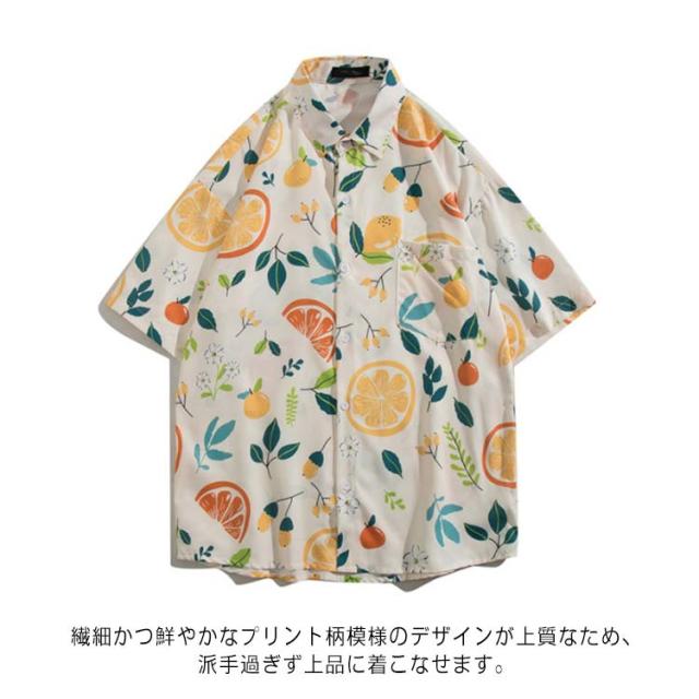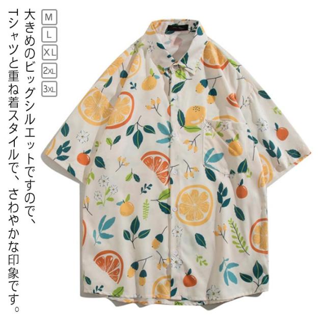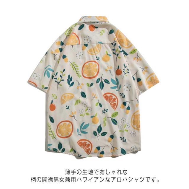 開襟シャツ 5分袖 メンズ 男女兼用 オレンジ 夏物 レモン柄 ハワイアン アロハシャツ 総柄 果物柄 ストリートリゾート レディース 可愛い ゆったり 体型カバー シャツ ヴィンテージ風 シンプル カジュアル ビーチ 旅行 海 大きいサイズ