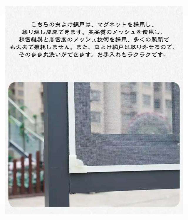| 【防虫・防蚊】こちらの虫除け網戸は、高密度メッシュで微細な虫・蚊の侵入も防ぎます。隙間もなく全面覆う窓用網戸タイプなので、虫除け網戸を窓枠に設置しておくと、窓を閉めなくても、虫や蚊などの侵入を気にせず、空気の通しが良くできます。 【カット可能・サイズ調節可能】この防虫ネットは、カットによるサイズ調節が可能です。お宅の窓大きさに完璧に合わせて防虫ネットをカットできます。だから、この防虫ネットはどんな窓枠にも網戸がぴったりと納まります。この防虫ネットキットがあれば、網戸を作るお手間もお金も節約します。 【通風性】この蚊よけ網戸の開口率が高く風通しも優れています。十分な風通しも得ることができます。夏には、エアコンを使わずに本品を取り付けることによって、空気の入れ替えが出来、風通しが良くなり涼しく暮らすことができます。 【優れた耐久性】こちらの虫よけ網戸は、マグネットを採用し、繰り返し開閉できます。高品質のメッシュを使用し、精密縫製と高密度のメッシュ技術を採用、多くの開閉でも丈夫で損耗しません。また、虫よけ網戸は取り外せるので、そのまま丸洗いができます。お手入れもラクラクです。 取付方法:?磁気ストリップの保護フィルムを剥がし、窓の周囲に貼り付けます。 ?もう一つの磁気ストリップを一緒に吸着させます。 ?網の位置を固定する。 ?網をはさみ込む。 ?余分な網をカットする。 ?角を取り付ける。防風クリップを取り付ける。 | |