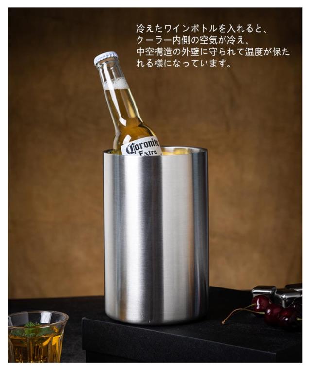 | 冷たく美味しい飲みごろ温度を長時間キープするボトルクーラー。 ステンレス製なので、耐久性が高く、長期間の使用にも耐えます。 冷えたワインボトルを入れると、クーラー内側の空気が冷え、中空構造の外壁に守られて温度が保たれる様になっています。 卓上に設置できるため、ホームパーティーやディナーの際に便利です。 シャンパンボトルクーラーとしても使用でき、特別な日のお祝いにぴったりです。 | |