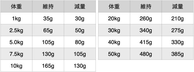 ・現在の体重を維持する場合は上表の[維持]を、減量する場合は[減量]を目安に便の状態、毛ヅヤなどを見ながら適宜調節してください。なお、理想量の必要量を与えるのではなく、現在の体重から給与量を決定してください。
