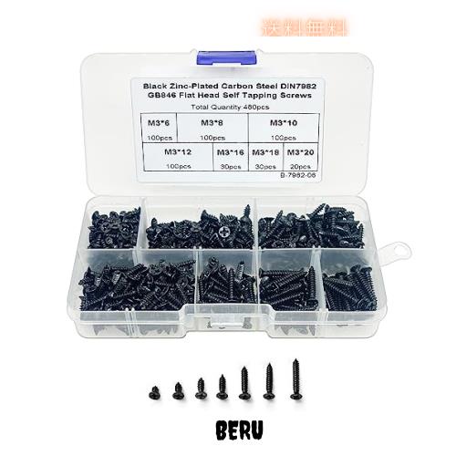 PENGLIN 480個 皿頭 タッピングネジ セット M3 3mm タッピングビス 十字穴 炭素鋼 7種類 ブラック 収納ケース付き