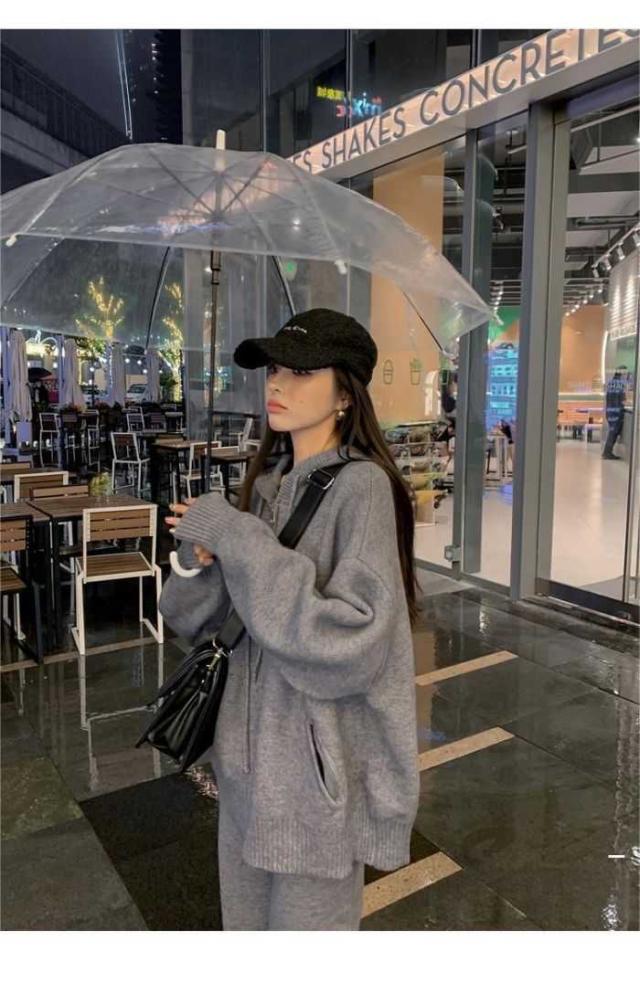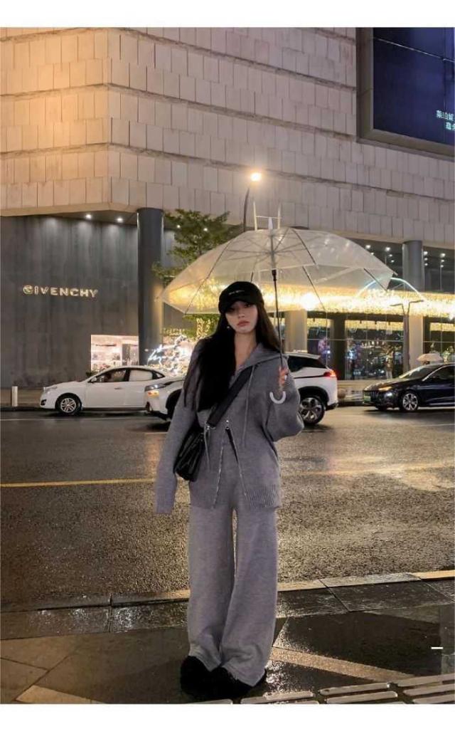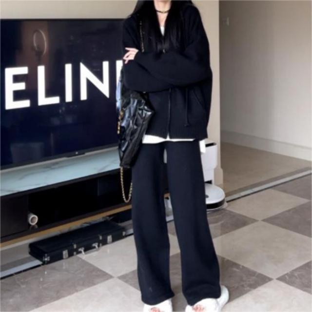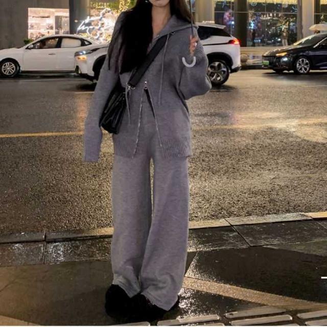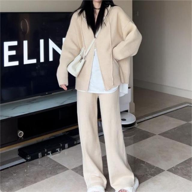 韓国風ファッションフード付きセーターセット 女性の秋冬の怠惰なスタイル ゆったりとしたニットカーディガンジャケット ワイドパンツツーピースセット