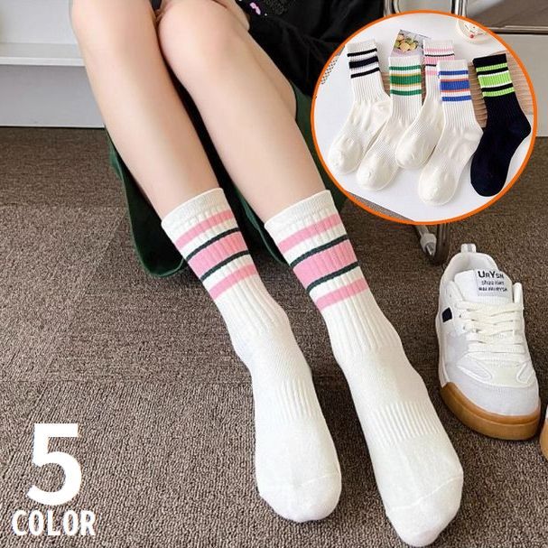 靴下 クルーソックス レディース くつ下 吸汗 防臭 通気性 太ボーダー柄 ライン リブ カジュアル ストリート系 フリーサイズ