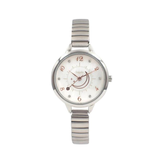【フェミニンなムーンポイント】月のワンポイントが女性らしさを感じるムーンジャバラウォッチが発売。【着脱スムーズなベルト】ゴムのように伸びる「ジャバラベルト」で、誰でも簡単に装着OK!【華やかな見た目】コーデのポイントになる華やかなメタリック調のカラー展開が魅力的。【可愛い月のワンポイント】文字盤の中央に月のワンポイントを配置し、フェミニンな印象に。【ゴールドパーツで高級感も】フレームや文字パーツにはゴールドカラーを採用。高級感もあるのがうれしい。【きらっと光るビジュー付き】文字盤にはビジューストーンを取り付け、よりエレガントでより女性らしいデザインに!【嬉しい3気圧防水】手洗いでの水しぶき、汗や雨などを想定した防水仕様で万が一、濡れても安心♪【正確な時を刻むムーブメント】ムーブメントは安心と信頼の日本製クォーツを採用。時間が狂いにくく高い性能性を誇る◎【プチギフトに贈るのも】華やかなデザインで友人やご家族にプチギフトで贈るのもオススメ♪