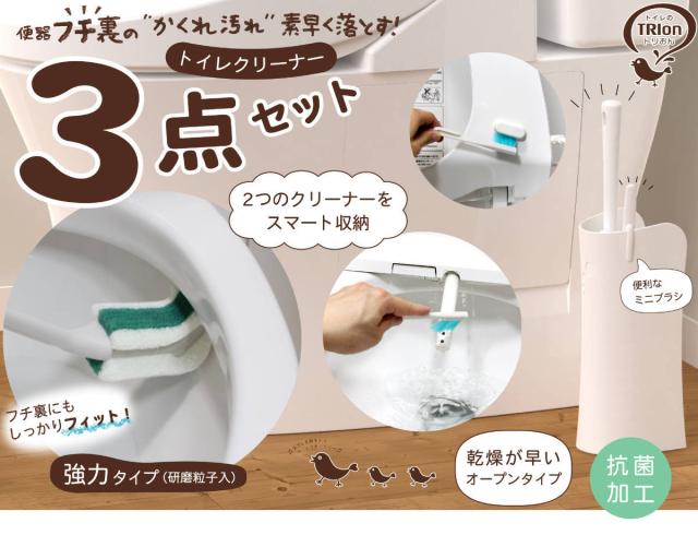 トイレブラシ トリおん フチ裏 清潔 クリーナー 強力 ケース付き ミニブラシ付き 抗菌 3点セット ( 傷つけない強力ブラシ アラウーノ対応 日本製 便器 フチウラ ノズル掃除 ミニブラシ トイレ掃除 )