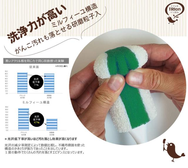 クリーナーは5枚の不織布をミルフィーユ状に重ね、側面で洗うことで汚れ落とし効果をアップ。頑固な汚れも落とせる研磨粒子入りです。