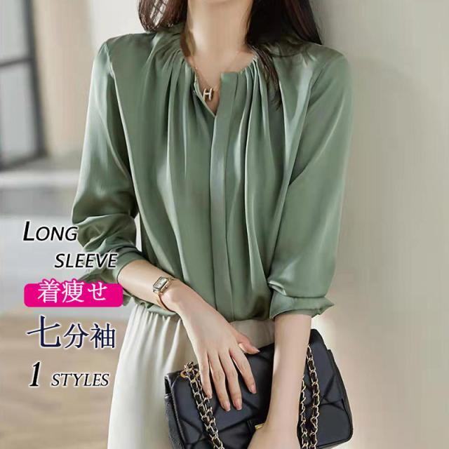 シフォン ブラウス レディース 七分袖 トップス スーツインナー 通勤 オフィス 防シワ 大人 カジュアル ゆったり ふんわり グリーン きれいめ