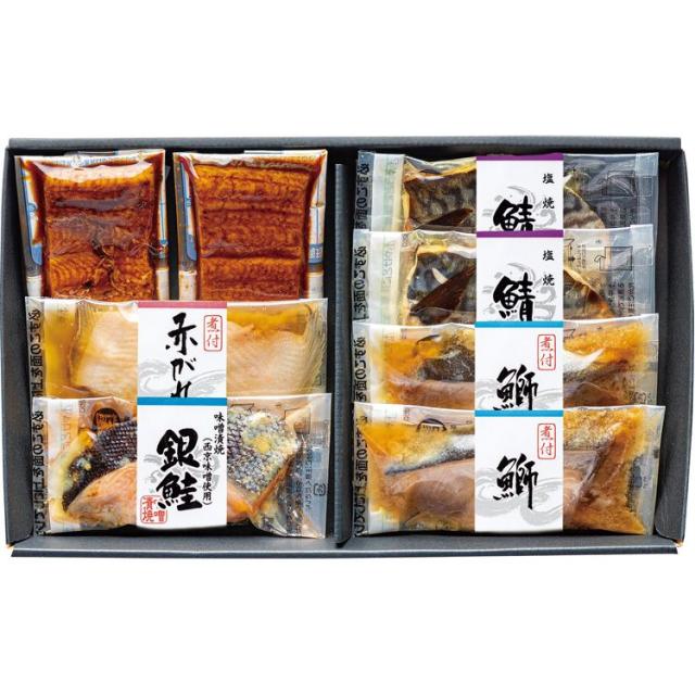 内容:鰻蒲焼40g×2/(原)国産、赤カレイ煮50g×1、ぶり煮付50g×2、鯖塩焼50g×2、銀鮭味噌焼50g×1