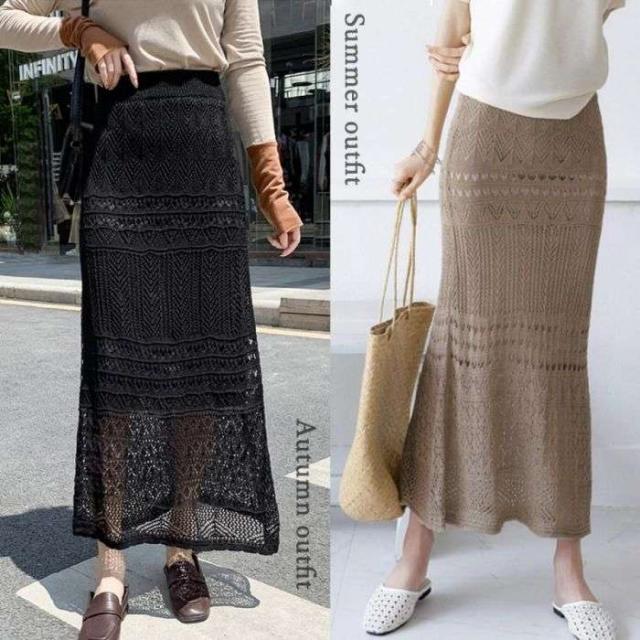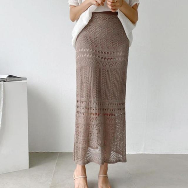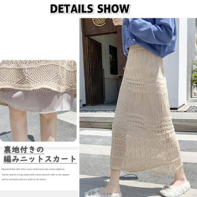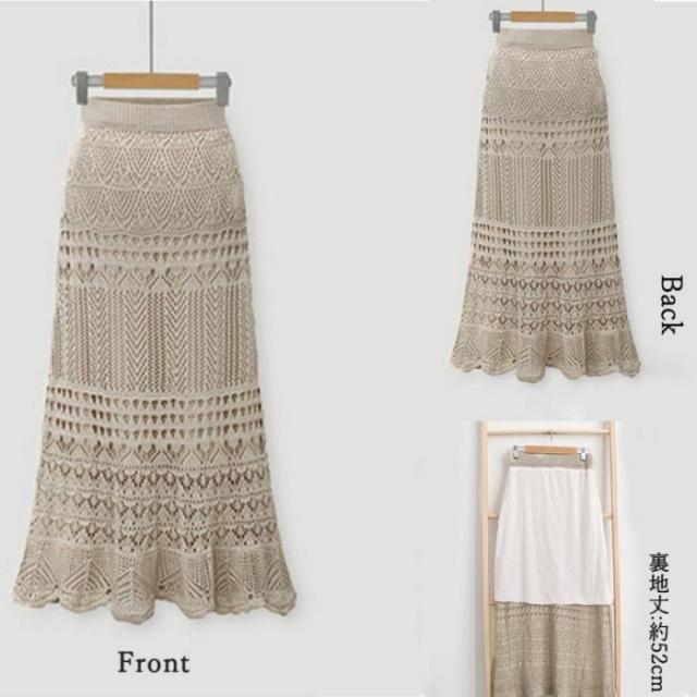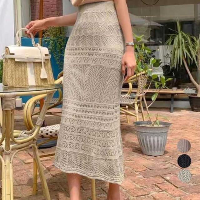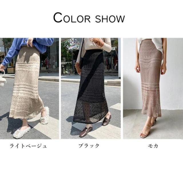 レディース 韓国風 ロングスカート かぎ編み タイトスカート 秋冬 きれいめ ミモレスカート フェミニン 透け感