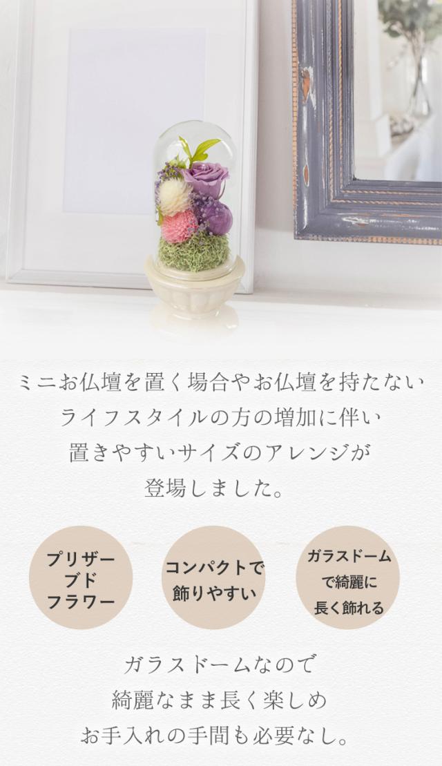 現代の生活様式に合わせて作られた コンパクトサイズのお仏壇や、 想い出の写真の近くに置いたりと、 どんな場所にも合わせやすい 洗練されたデザインが特徴です。 お盆やお彼岸などの贈り物や 手土産にはコンパクトでありながら デザイン性の高い、 ガラスドーム仏花をおすすめ致します。 |