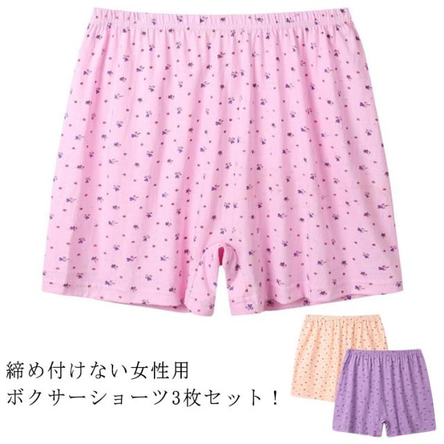 | 締め付けない女性用ボクサーショーツ3枚セット! お腹まですっぽりの深ばき丈、優しい肌触りの綿生地で吸汗性、通気性があり。 ウエストはゴムでお腹を締めつけにくく、裾広がりで履きやすく、脱ぎやすい。 かわいい花柄です。 | |