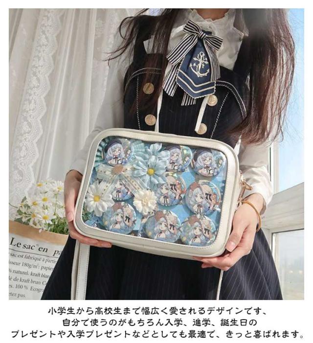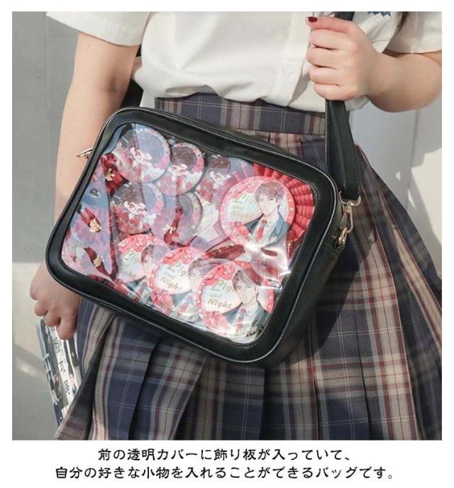 | 【痛ショルダー クリアバッグ】【軽量・大容量】 前の透明カバーに飾り板が入っていて、自分の好きな小物を入れることができるバッグです。 好きな芸能人や、アニメの写真 、缶バッジ、ストラップ、キーホルダーなどを入れるだけで、簡単に世界で1つたったのオリジナルバッグの完成です、毎日楽しく使える。 小さめながらも本やお財布、スマートフォンなどを快適に収納できる機能的なデザイン。外出先でも必需品を手軽に持ち運び可能。 小学生から高校生まで幅広く愛されるデザインです、自分で使うのがもちろん入学、進学、誕生日のプレゼントや入学プレゼントなどとしても最適で、きっと喜ばれます。 普段にも、オタク活にも使える万能のデザイン、普段使いしやすいデザインなので、痛バ初心者さんにもおすすめです! | |
