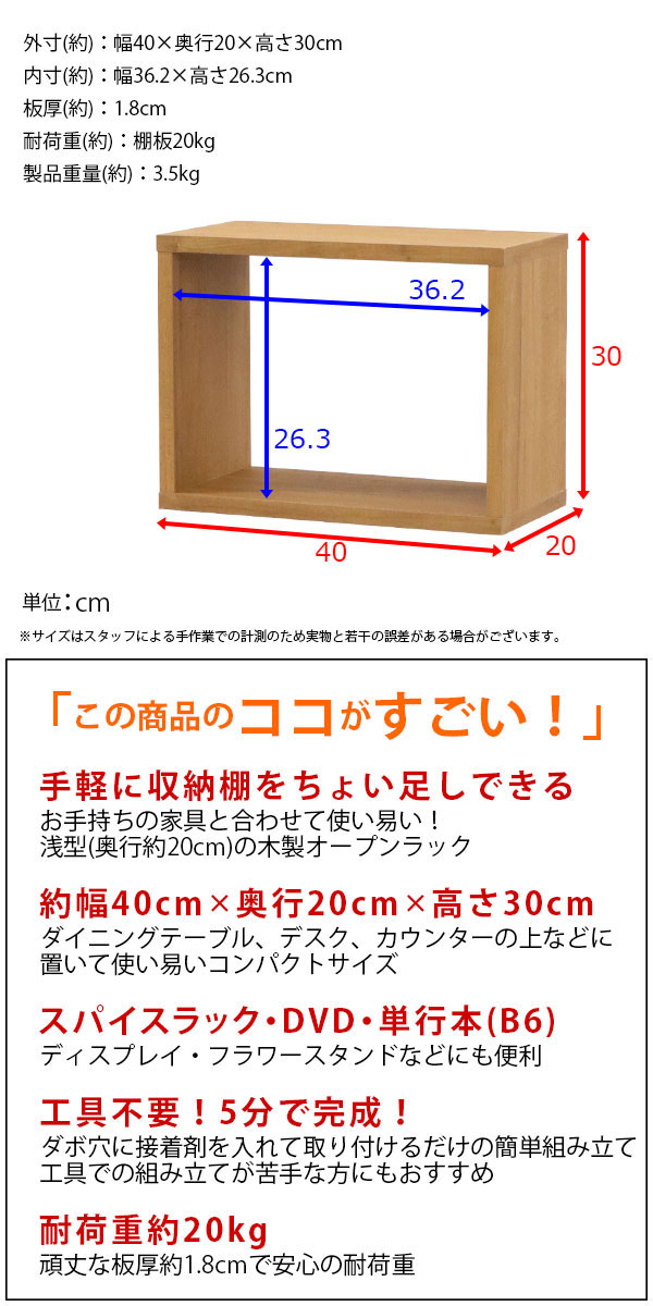 オープンラック 1段 40×30 2個セット 奥行20cm 収納 棚 薄型 おしゃれ 組み合わせ自由 幅40cm 高さ30cm 頑丈 耐荷重20kg 積み重ね 収納 ラック ディスプレイラック 卓上ラック 飾り棚 本棚 コミック 漫画 文庫本 雑誌 アクスタ 机上ラック モニター台 木製 ブラウン