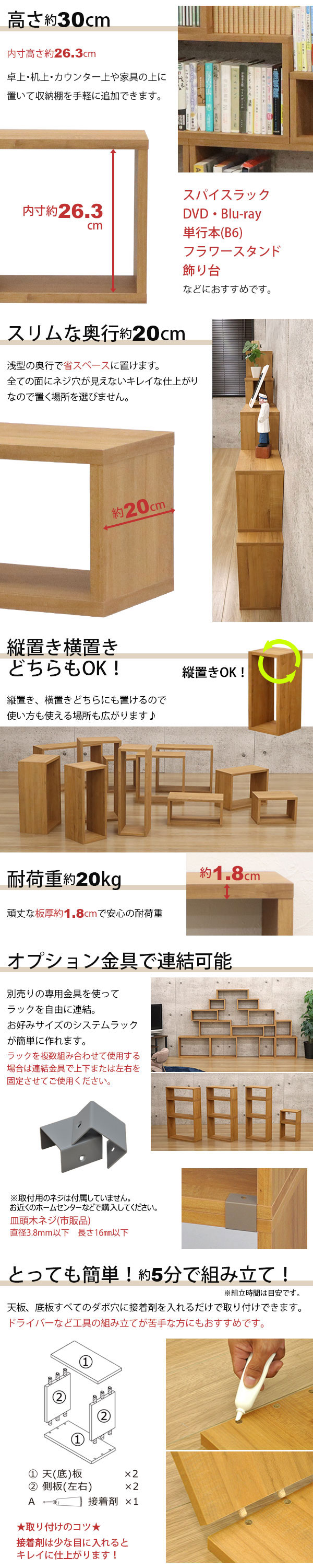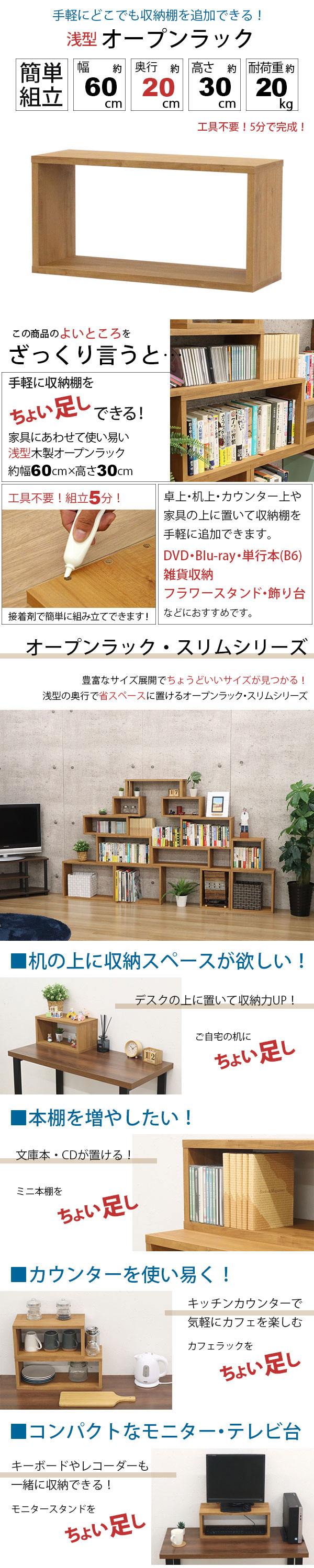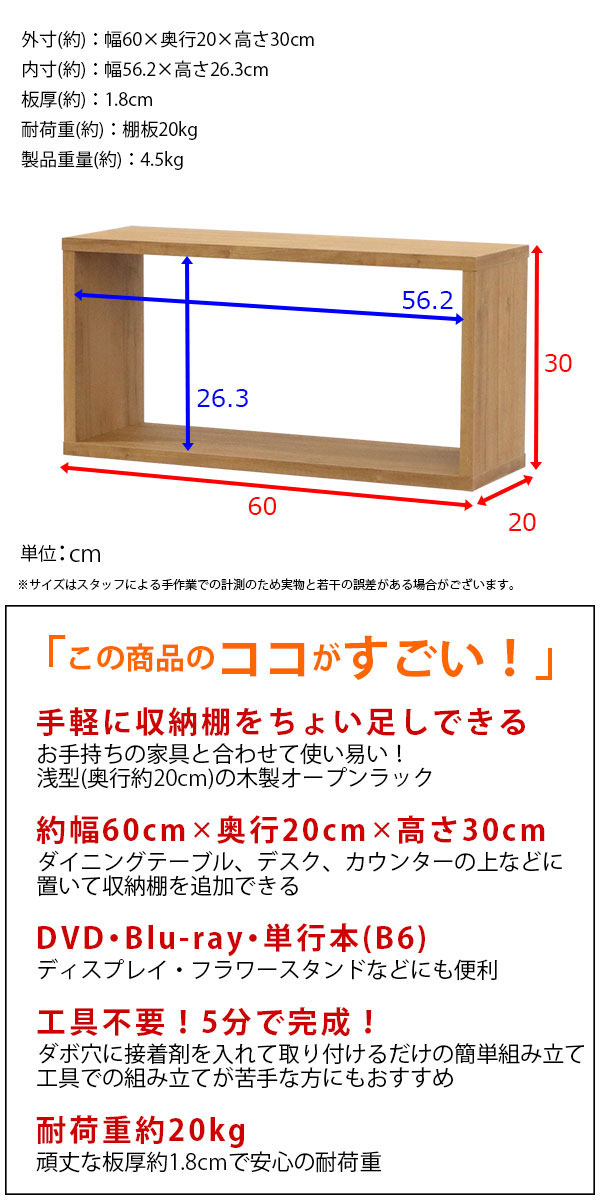 オープンラック 1段 60×30 2個セット 奥行20cm 収納 棚 薄型 おしゃれ 組み合わせ自由 幅60cm 高さ30cm 頑丈 耐荷重20kg 積み重ね 収納 ラック ディスプレイラック 卓上ラック 飾り棚 本棚 コミック 漫画 文庫本 雑誌 アクスタ 机上ラック モニター台 木製 ブラウン
