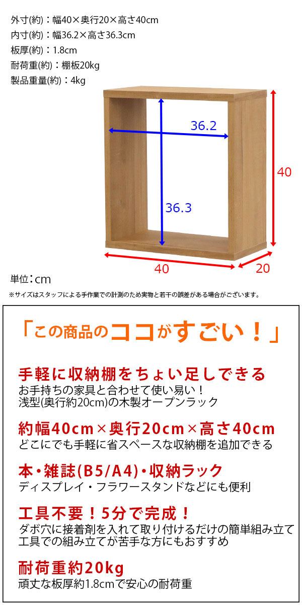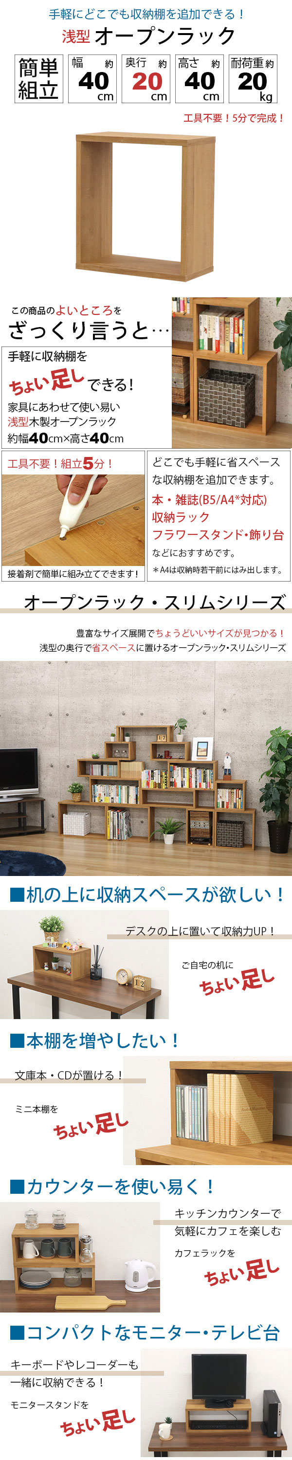 スリムな奥行20cm 幅40 高さ40 手軽にちょい足しラック(収納・飾り台・書棚) 2個セット の説明