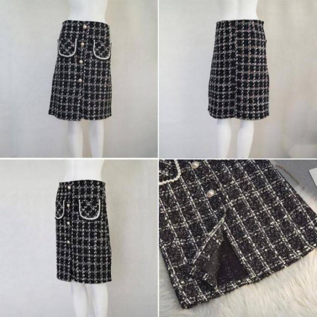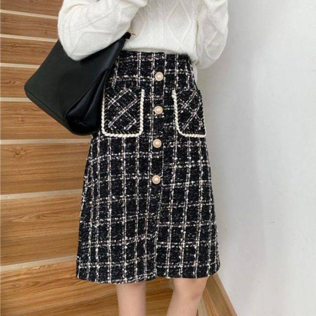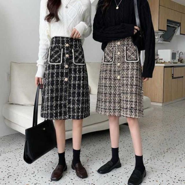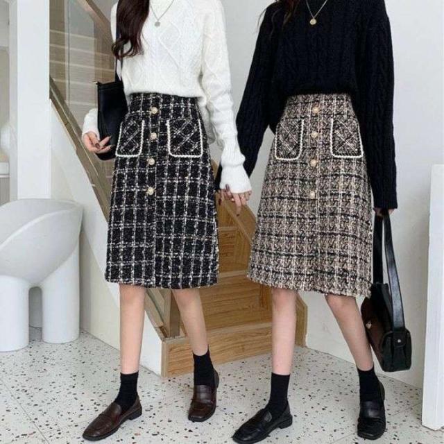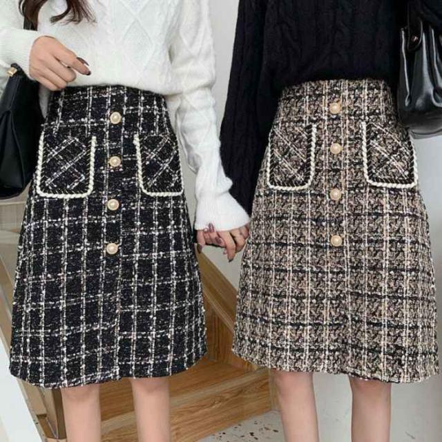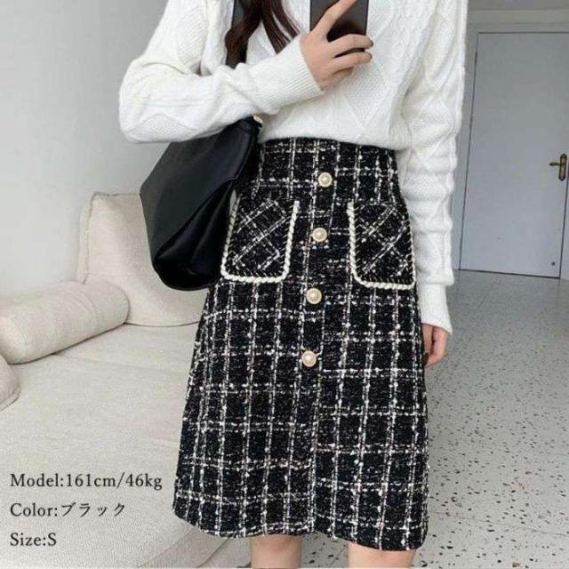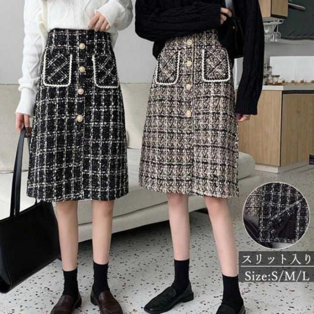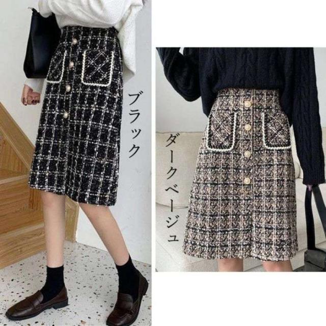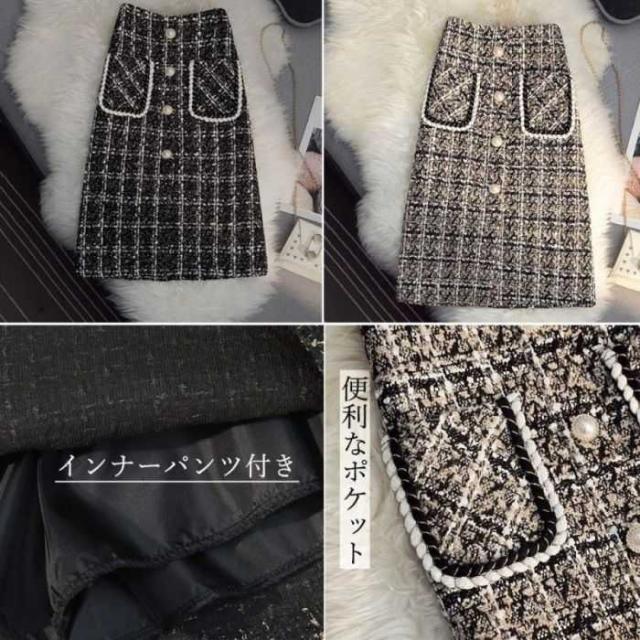 ツイード風スカート インナーパンツ付き ハイウエスト ひざ丈 韓国風 ポケット付き