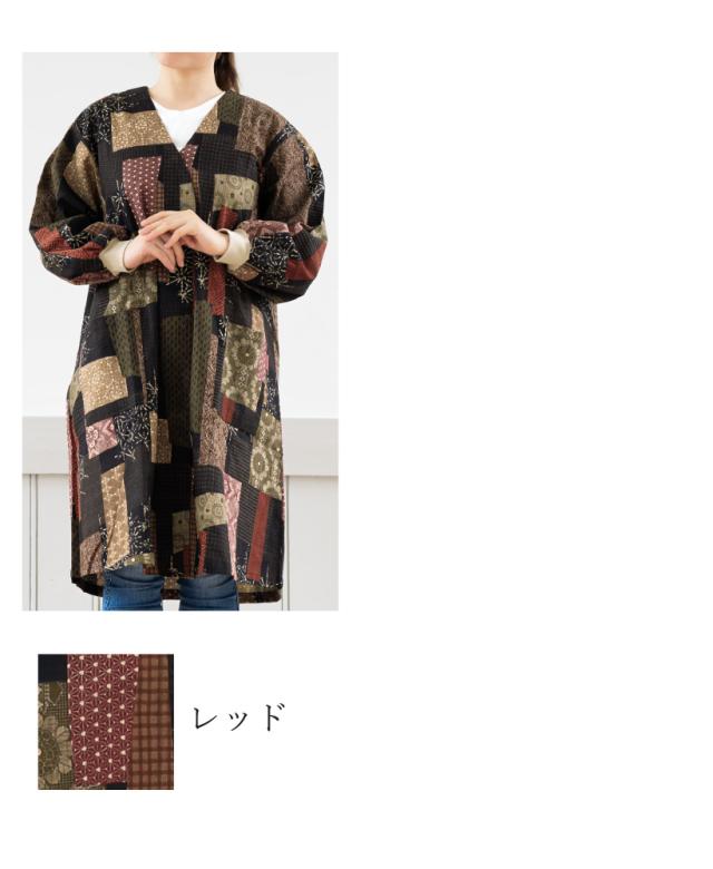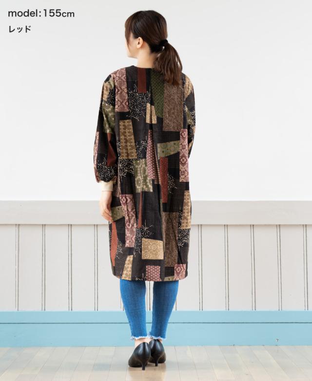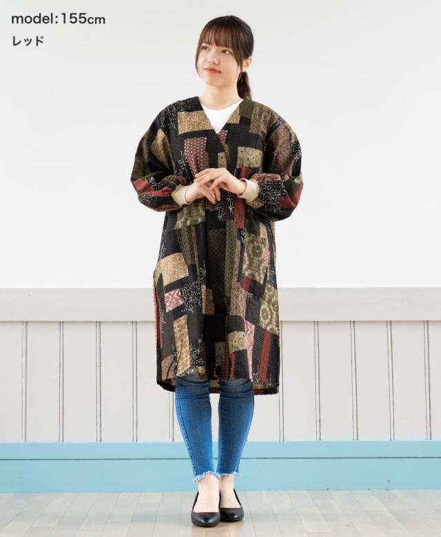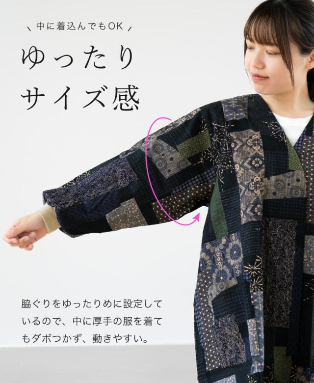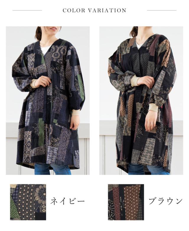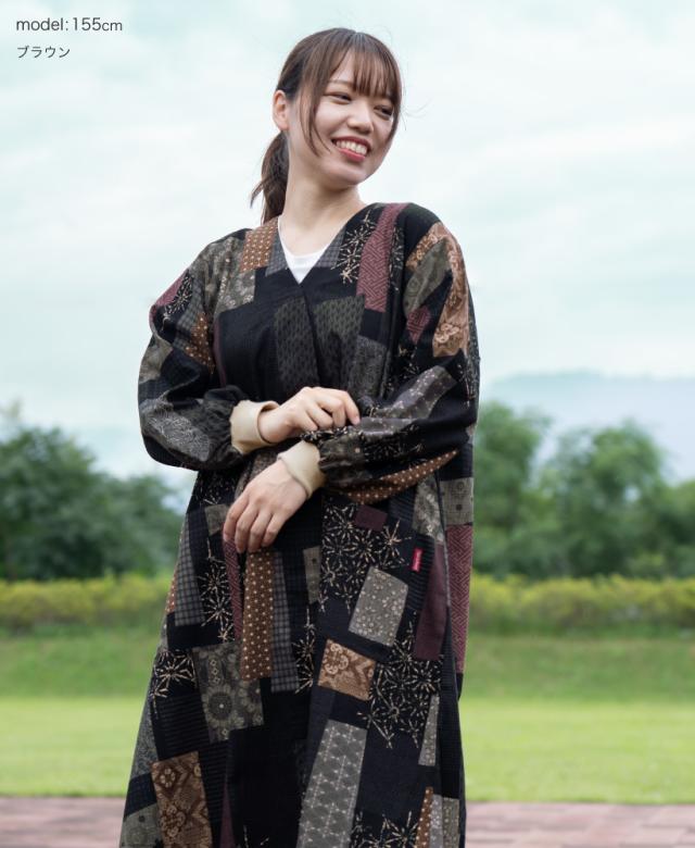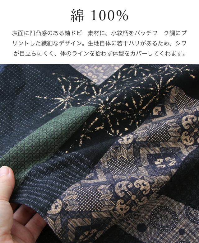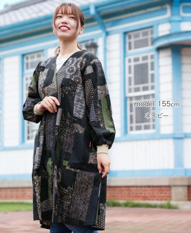 上着としても使える、シックな和柄デザインの前開き割烹着。お洋服感覚で着られるので、そのままお出かけも。香川県で1枚1枚丁寧に縫製する、高品質な割烹着。ゆったりとしたサイズ感で、着る人を選ばず、プレゼントギフトとしてもおすすめです。