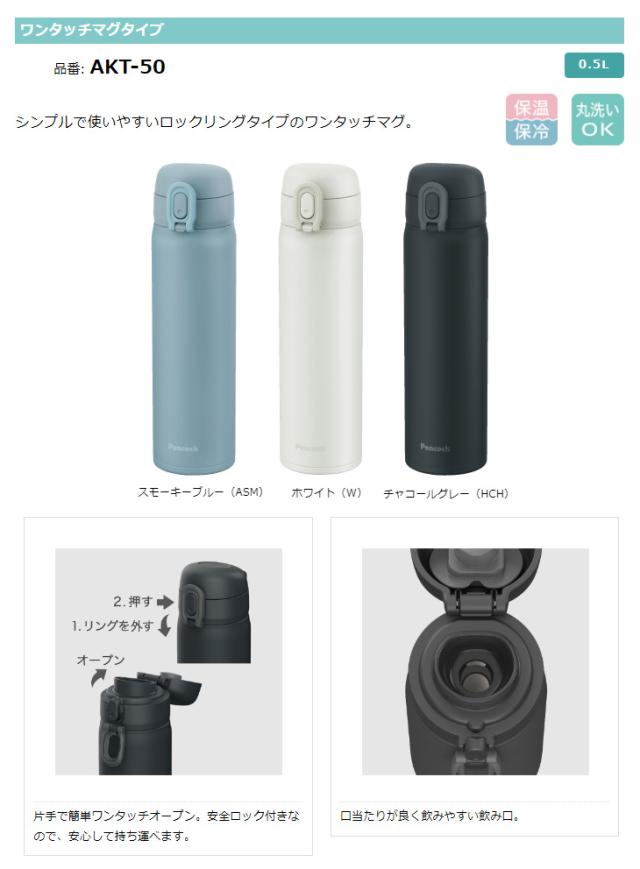 口当たりが良く飲みやすい飲み口。 【台数限定!ご注文はお早めに!】 片手で簡単ワンタッチオープン。安全ロック付きなので、安心して持ち運べます。 AKT50 シンプルで使いやすいロックリングタイプのワンタッチマグ。