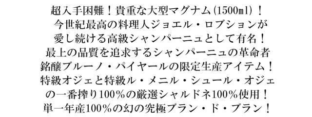 超入手困難!貴重な大型マグナム(1500ml)! 今世紀最高の料理人ジョエル・ロブションが 愛し続ける高級シャンパーニュとして有名! 最上の品質を追求するシャンパーニュの革命者 銘醸ブルーノ・パイヤールの限定生産アイテム! 特級オジェと特級ル・メニル・シュール・オジェ の一番搾り100%の厳選シャルドネ100%使用! 単一年産100%の幻の究極ブラン・ド・ブラン!