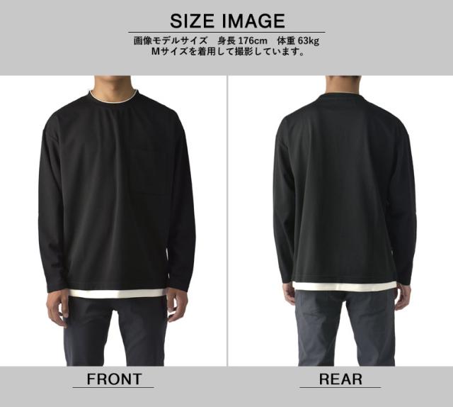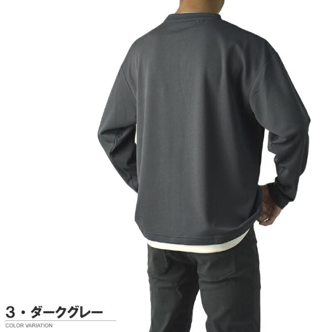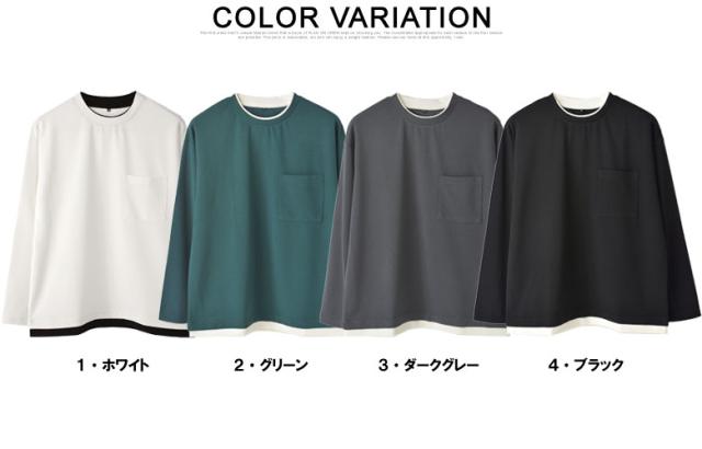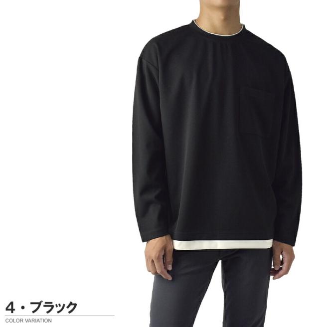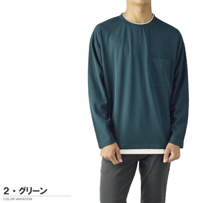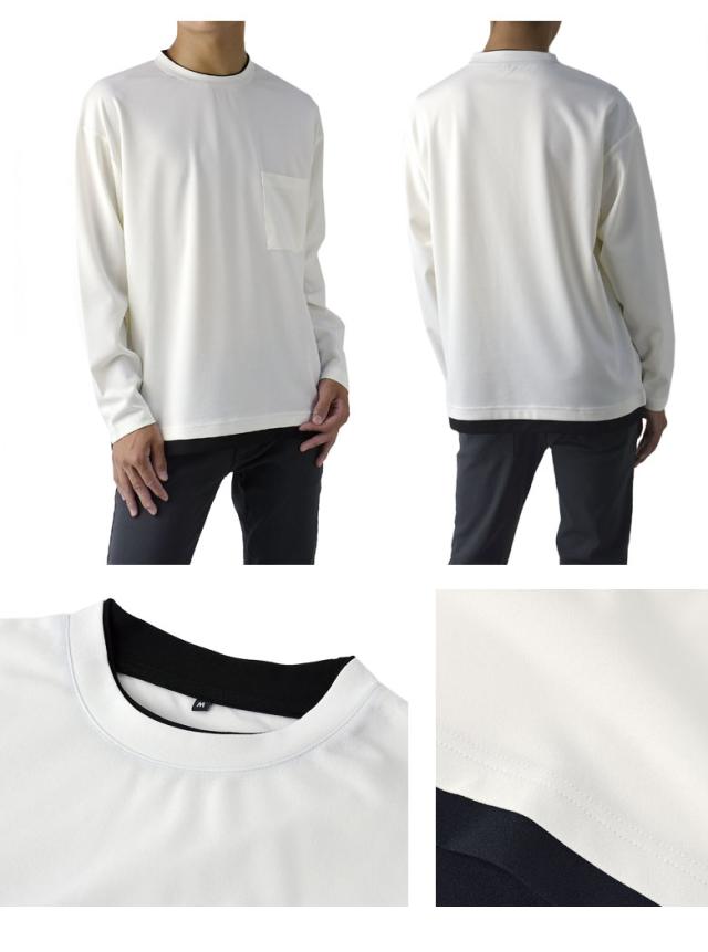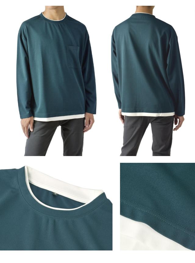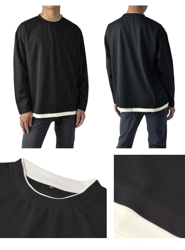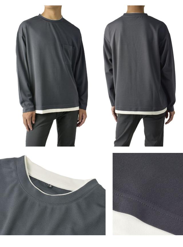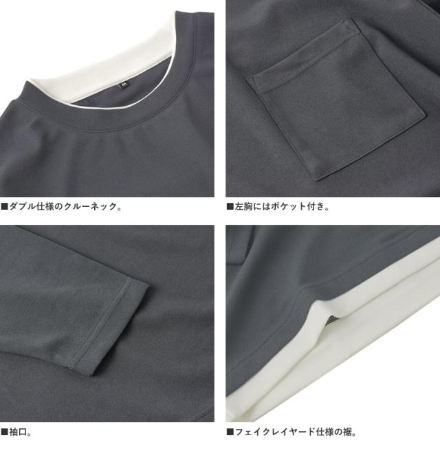 メンズ ダブルネック クルーネック フェイクレイヤード 長袖Tシャツ 梨地 UVカット ストレッチ ドライ ユニセックス イージーケア ワイドシルエット 胸ポケット【A9W】【パケ1】