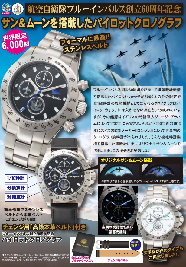 ブルーインパルス創設60周年を記念して複雑時計機構を搭載したパイロットウォッチが6000本のみの限定で登場!時計の複雑機構として知られるクロノグラフはパイロットウォッチには欠かせない存在として知られています。その起源はイギリスの時計職人ジョージ・グラハムによって1702年に考案され、それから200年後の1913年にスイスの時計メーカー「ロンジン」によって世界初のクロノグラフ時計が作られました。そんな複雑時計機構を搭載した腕時計に、更にオリジナルサン&ムーンを搭載。ぜひこの機会をお見逃しなく!■オリジナル サン&ムーン機構。■夜間の観認性も高い強蓄光機能。■簡単にステンレスベルトから本革ベルトにチェンジ可能!■チェンジ用「高級本革ベルト」付き。■世界限定6,000個。■公式ロゴ入りのブラックケース入り。
