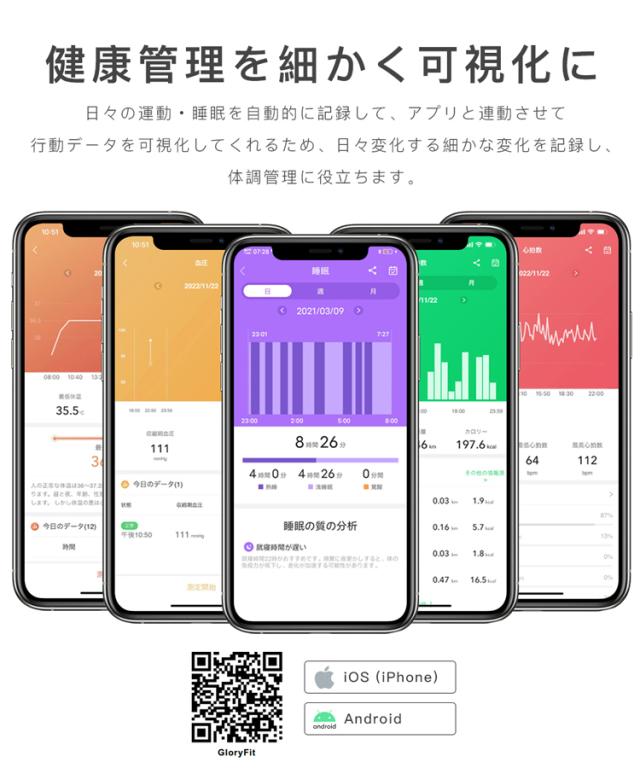 皮膚温、心拍数、血圧が測定でき、アプリで同期した後自分の健康状態データが一目で分かる。