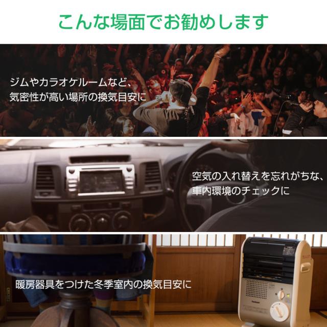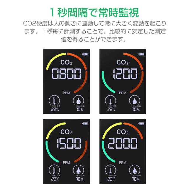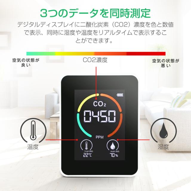 デジタルディスプレイに二酸化炭素(CO2)濃度を色と数値で表示、同時に湿度や温度をリアルタイムで表示することができます。
