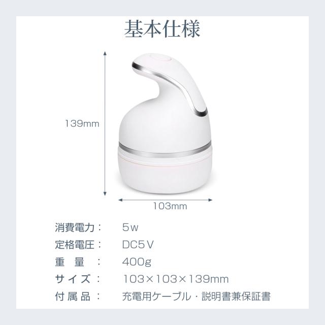 基本仕様消費電力:5w定格電圧:DC5V重量:400gサイズ:103×103×139mm付属品:充電用ケーブル・説明書兼保証書関連キーワード:ヘッドスパ EMS 家電 自宅 頭皮マッサージ 器 ブラシ プレゼント ギフト 電動 健康 美容 効果