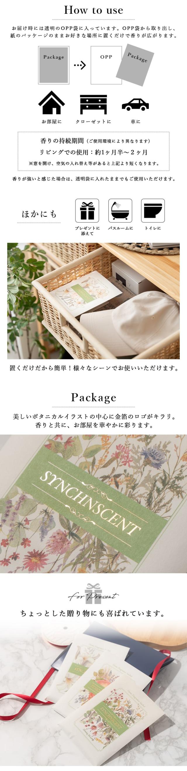 透明袋から取り出し、紙袋の封を開けずにご使用ください。 引き出しやクローゼットに入れて、衣類やリネンに爽やかな香りをプラスしたりリビングや玄関、洗面所、トイレなどに置いて香りをお楽しみください。