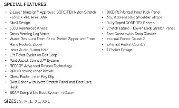 | | このビブはナイロンベースの2レイヤーストレッチゴアテックスを使用していて、アンバサダー達からの様々なフィードバックをベースに開発されたビブです。コンタクトの多い膝や裾には500デニールの強度のある生地がレイヤードで補強され生地が傷つき切れたりすることを防ぎます。ハイクアップで足を上げて歩く際にも股下の引っかかりが少なく、適度にゆとりのあるフィット感はストレス無く歩く事が出来ます。背中のストレッチパネルは通気性も良く伸縮性も良いです。ポケットも多く収納性が良いのもポイントです。 |