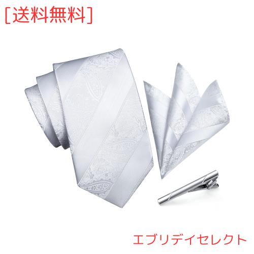 [HISDERN] ネクタイ 白 結婚式 チーフ メンズ ビジネス ハンカチ おしゃれ ネクタイネ 3点セット クリップ 高級 礼服 メンズ セット