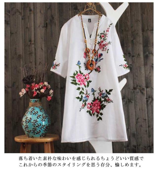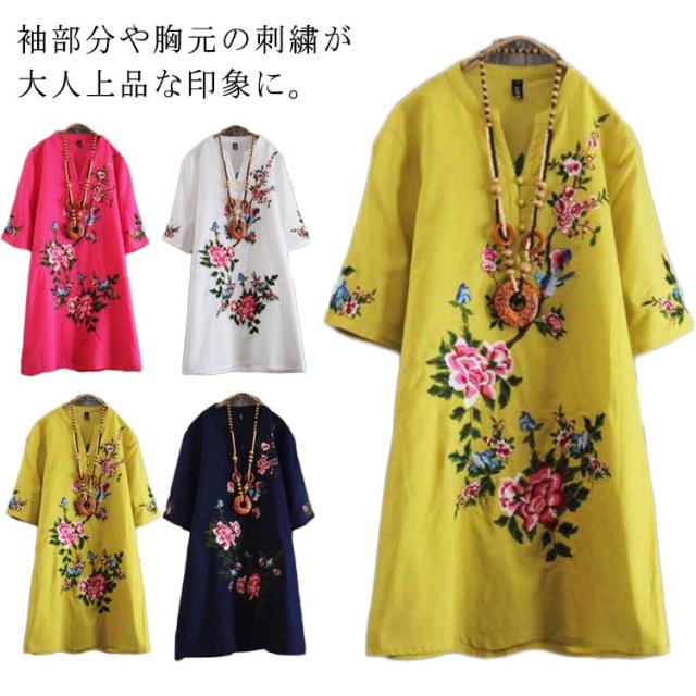 エスニックワンピース 花柄 刺繍ワンピース 刺繍 アジアン ワンピース チュニック シャツワンピース 半袖 カジュアルワンピース ミディアム 春夏 ナチュラル トレロ かわいい 送料無料 着るだけで雰囲気高まる 民族 レトロ リゾートワンピース